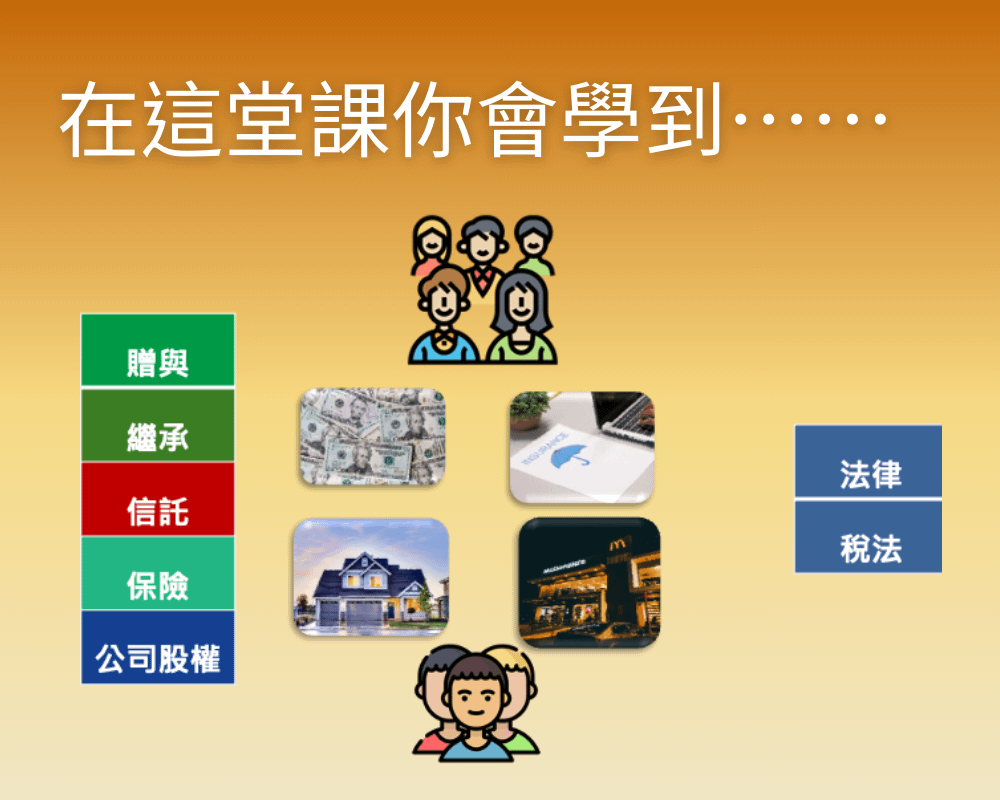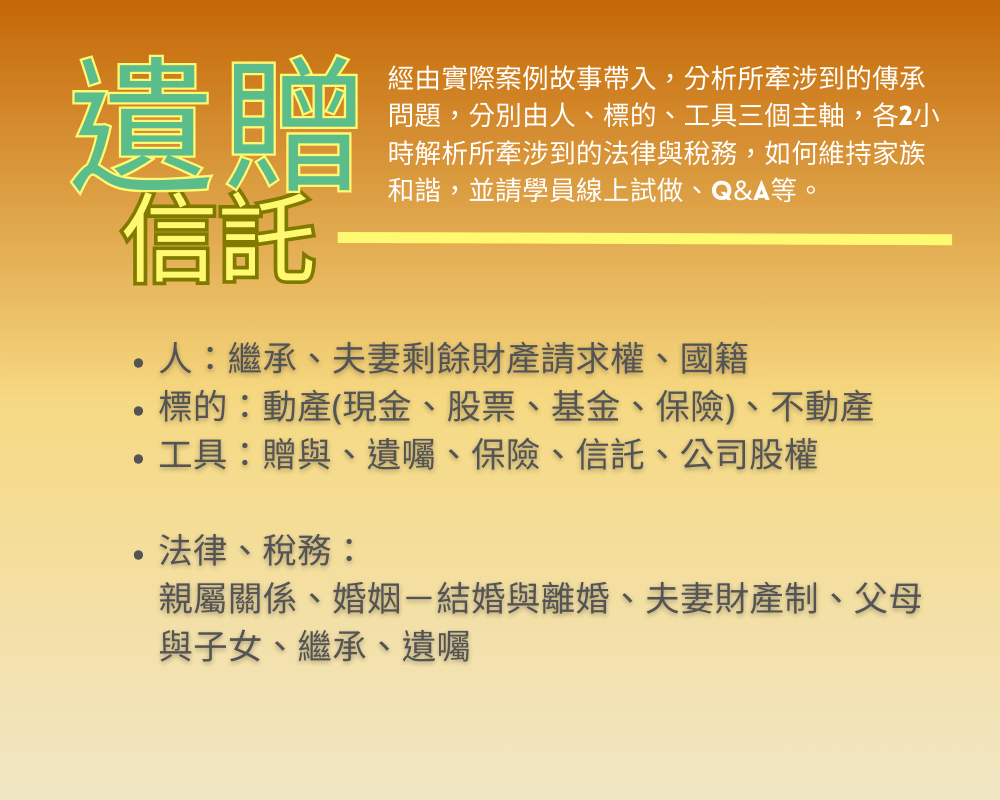 劉兆安深入淺出經由實際案例故事帶入,分析所牽涉到的傳承問題,分別由人、標的、工具三個主軸,各2小時解析所牽涉到的法律與稅務,如何維持家族和諧,並請學員線上實作操練。💝今周學堂舊學員享有優惠價再9折優惠,優惠折扣碼請私訊Line今周學堂官方客服:https://lin.ee/UD62Ry1