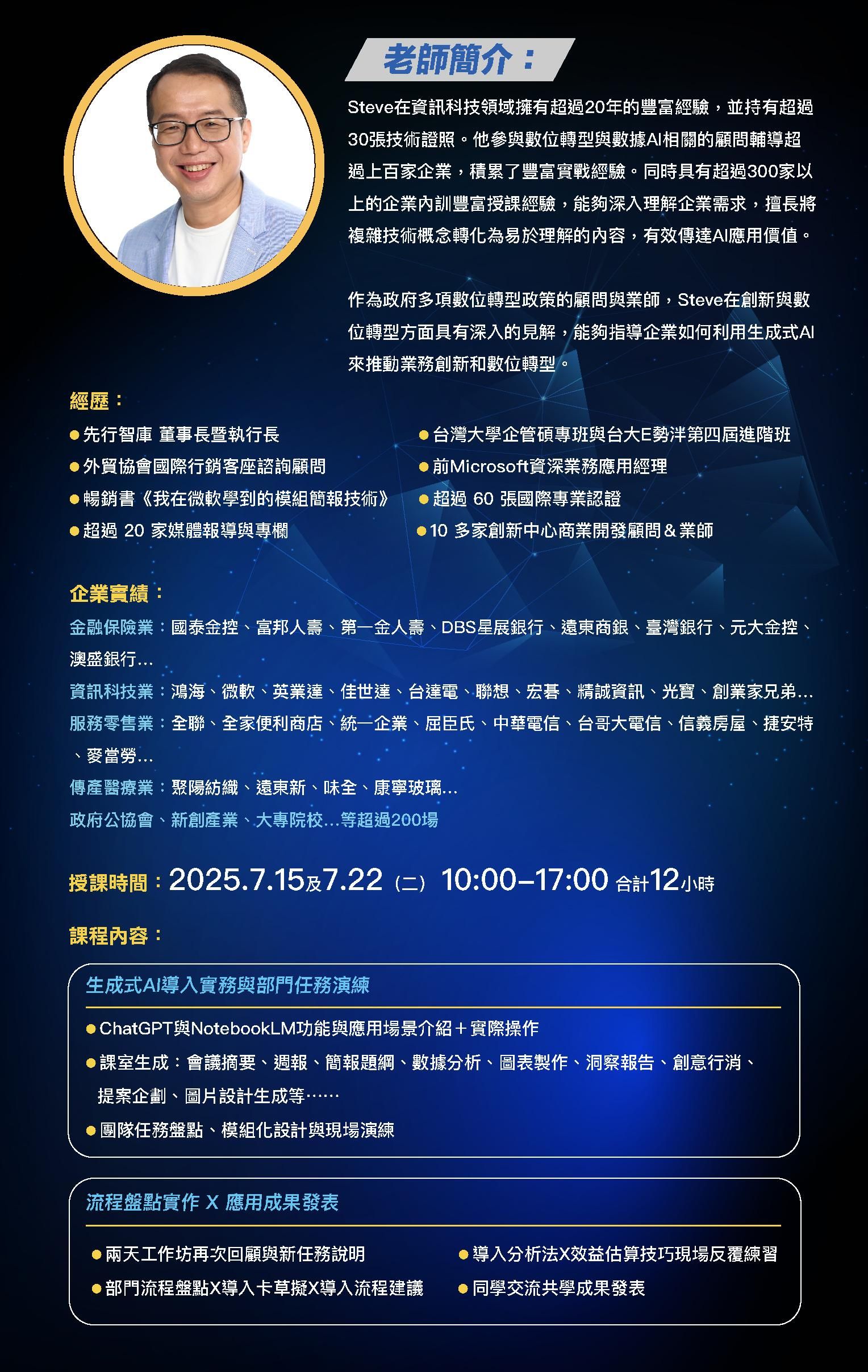 作為政府多項數位轉型政策的顧問與業師,Steve在創新與數位轉型方面具有深入的見解,能夠指導企業如何利用生成式AI來推動業務創新和數位轉型。