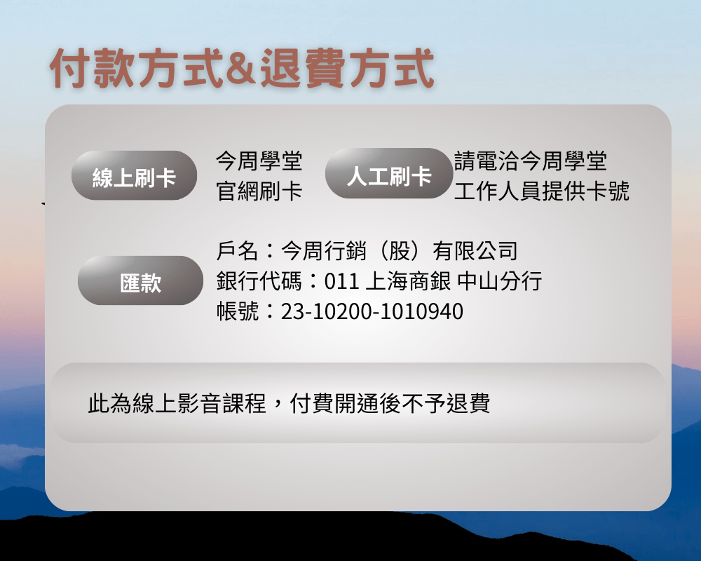本講座課程觀看期限1年,購買課程後,1 年內不受時間及地點限制,皆可無限次數、重複觀看內容!如未來課程有任何更新,都可以持續學習,不用再額外付費。今周學堂保留課程上下架權利。
