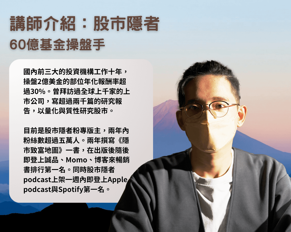 目前是股市隱者粉專版主,兩年內粉絲數超過五萬人。兩年撰寫《隱市致富地圖》一書,在出版後隨後即登上誠品、Momo、博客來暢銷書排行第一名。同時股市隱者podcast上架一週內即登上Apple podcast與Spotify第一名。