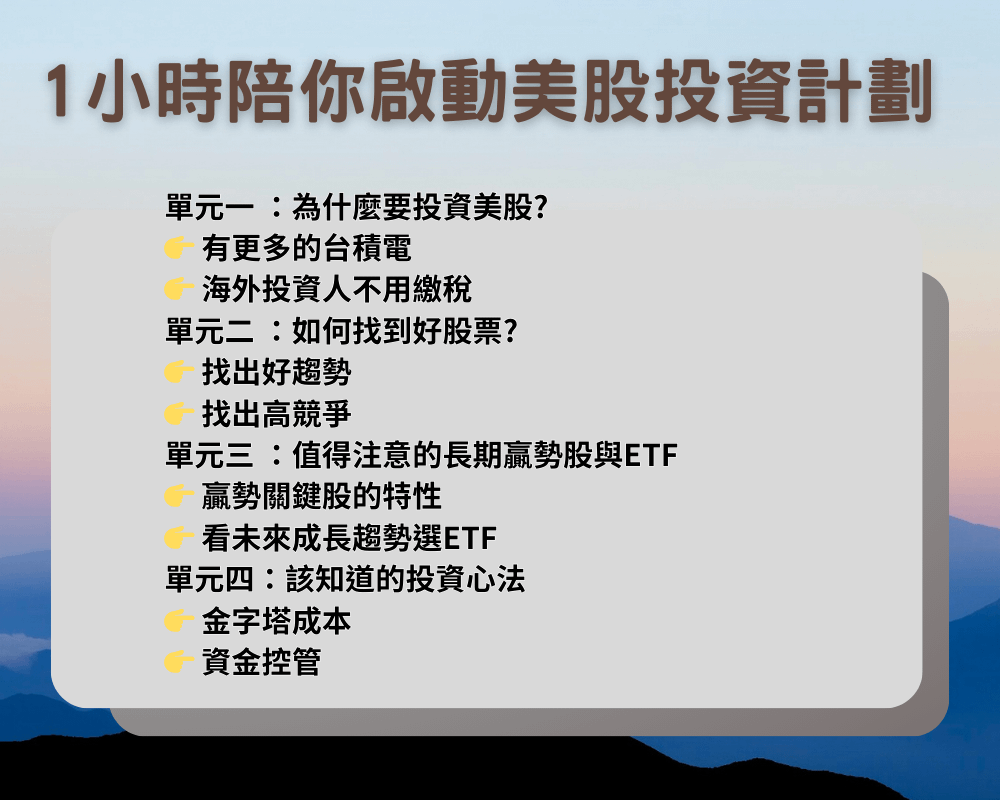 透過清楚又簡單的課程解說,輕鬆引領台灣投資人跨出國界,運用獨創的「贏勢股+ETF」策略,智慧且自信的攻克美股,安穩賺全世界持續成長績優公司的錢,安心財務自由退休。