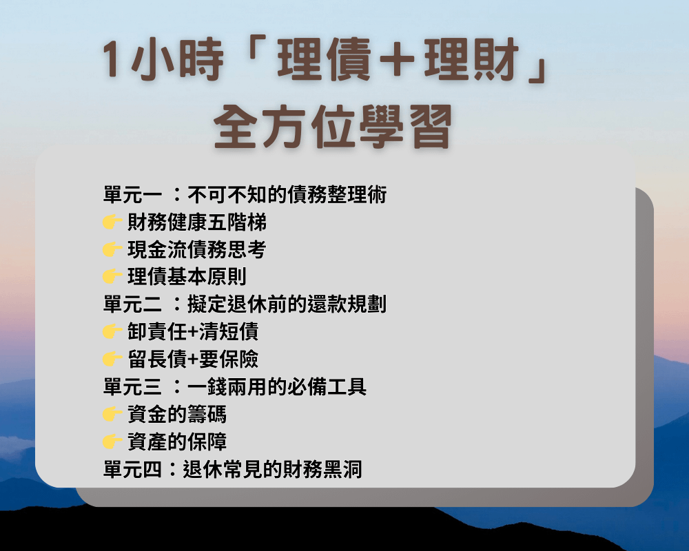 從「財務健康五階梯」切入,帶您檢視您的資產負債狀況,透過現金流的債務思考,以及清楚完整的債務整理表,陪你抓出自己的財務漏洞,運用「高變低、多變少、小再大」三個理債基本原則,引領您從理債開始,逐步邁入財務健康的理財世界。