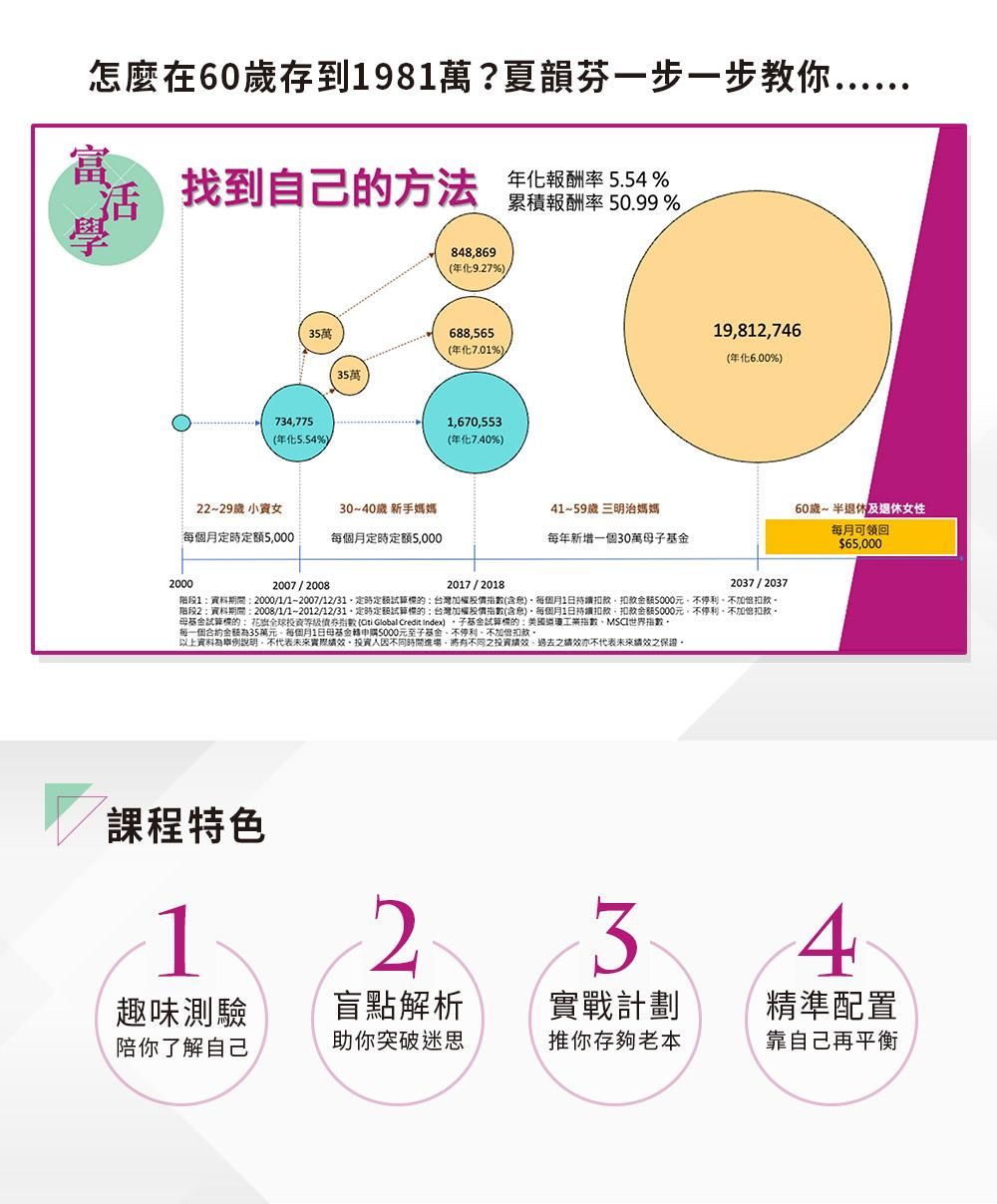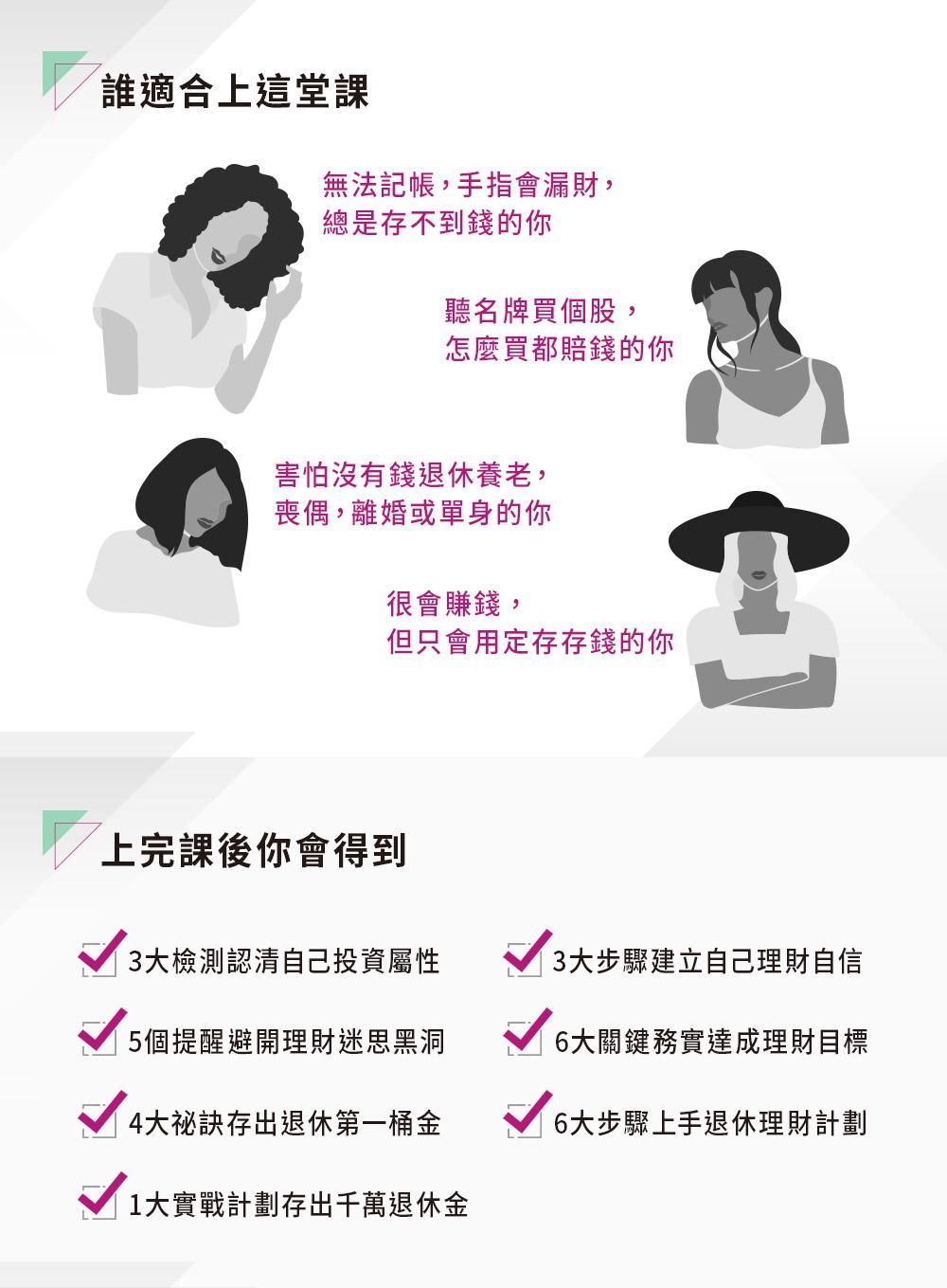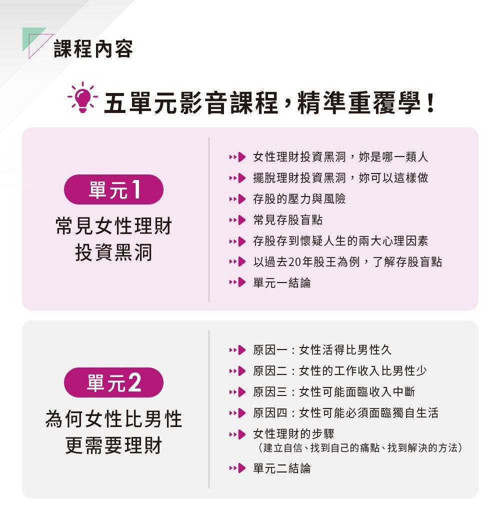 5個提醒6大關鍵助女人三錢護一生,富樂生活人生不瞎忙,用更智慧的方法愛自己和保護自己。(購買單套課程可無限次重覆觀看至2024.12.31) 定價3000元。