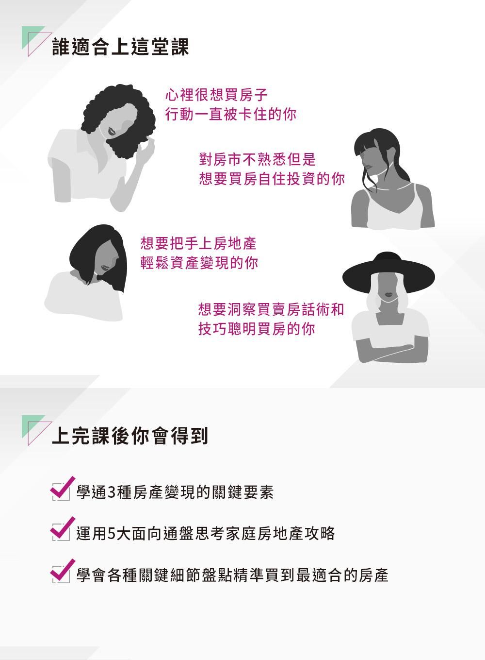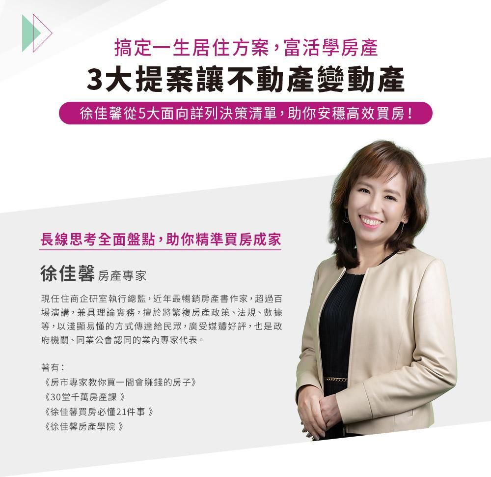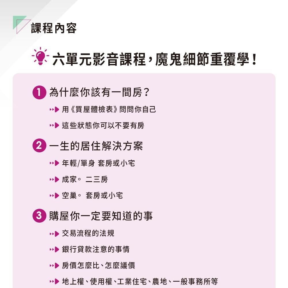 從買房到住房,給妳最完整的實務教戰守則,讓妳在不同生命階段不同身分角色下,買對房產,並且學會活化房地產,充實富活人生「進可攻退可守」的底氣。(購買單套課程可無限次重覆觀看至2024.12.31) 定價3000元。