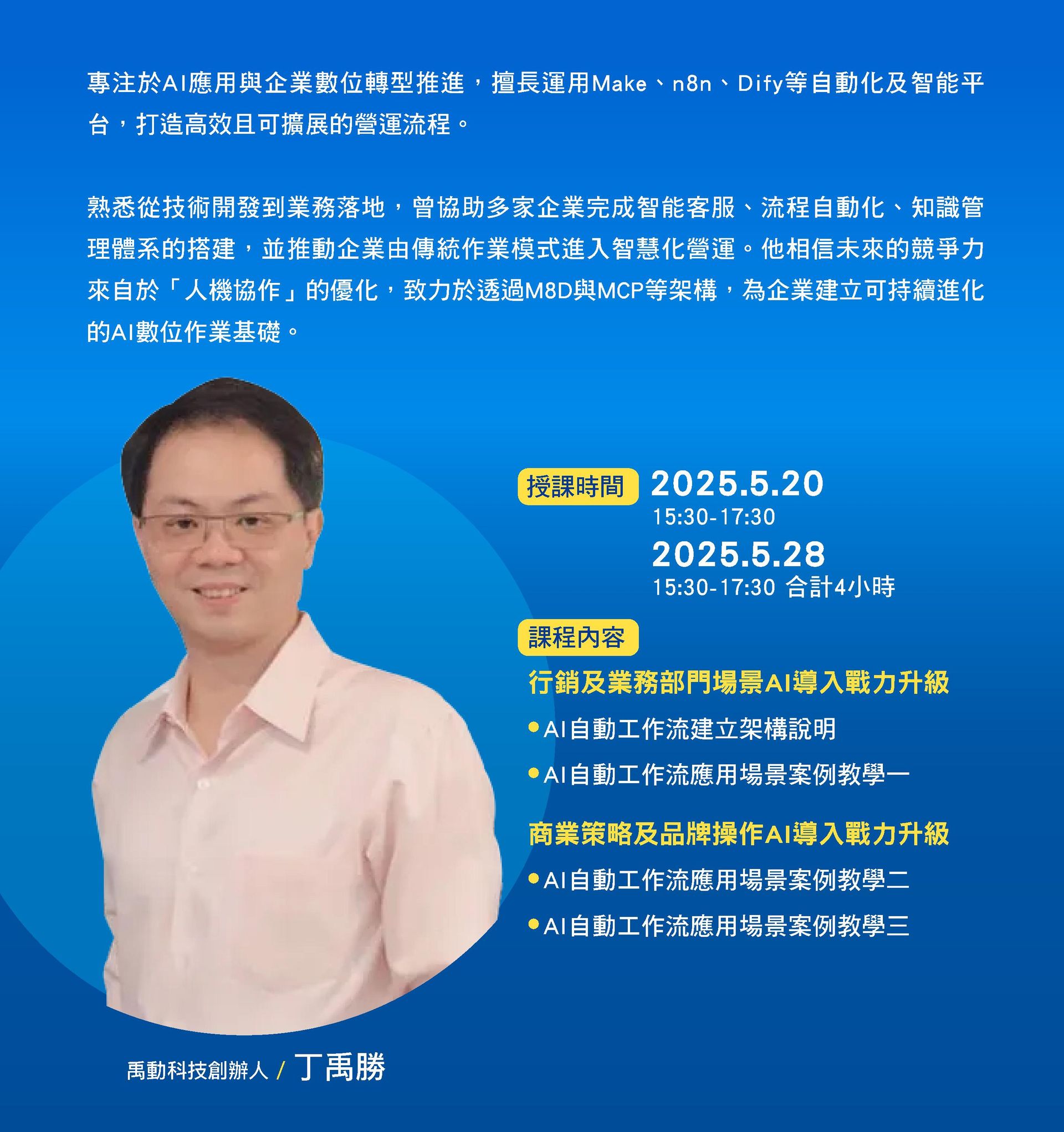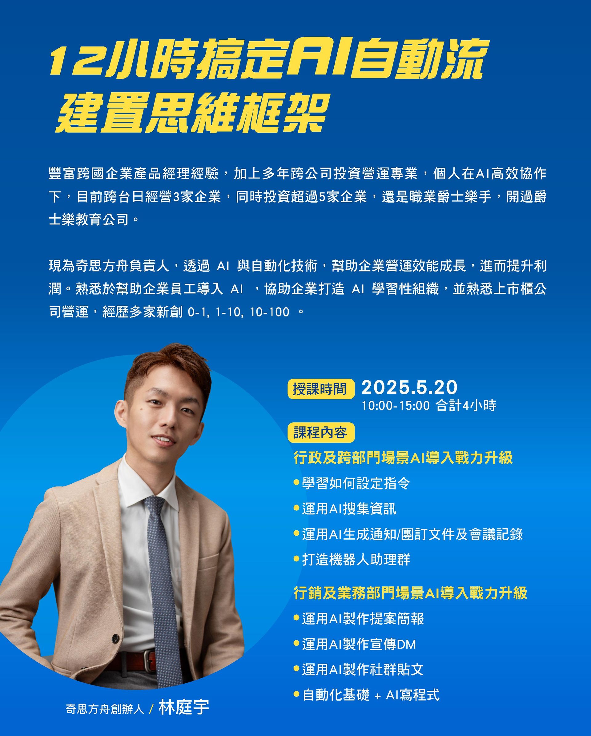 ✅ 提升團隊效率與戰力**:實作【行銷、業務、行政、HR】部門常用AI自動工作流