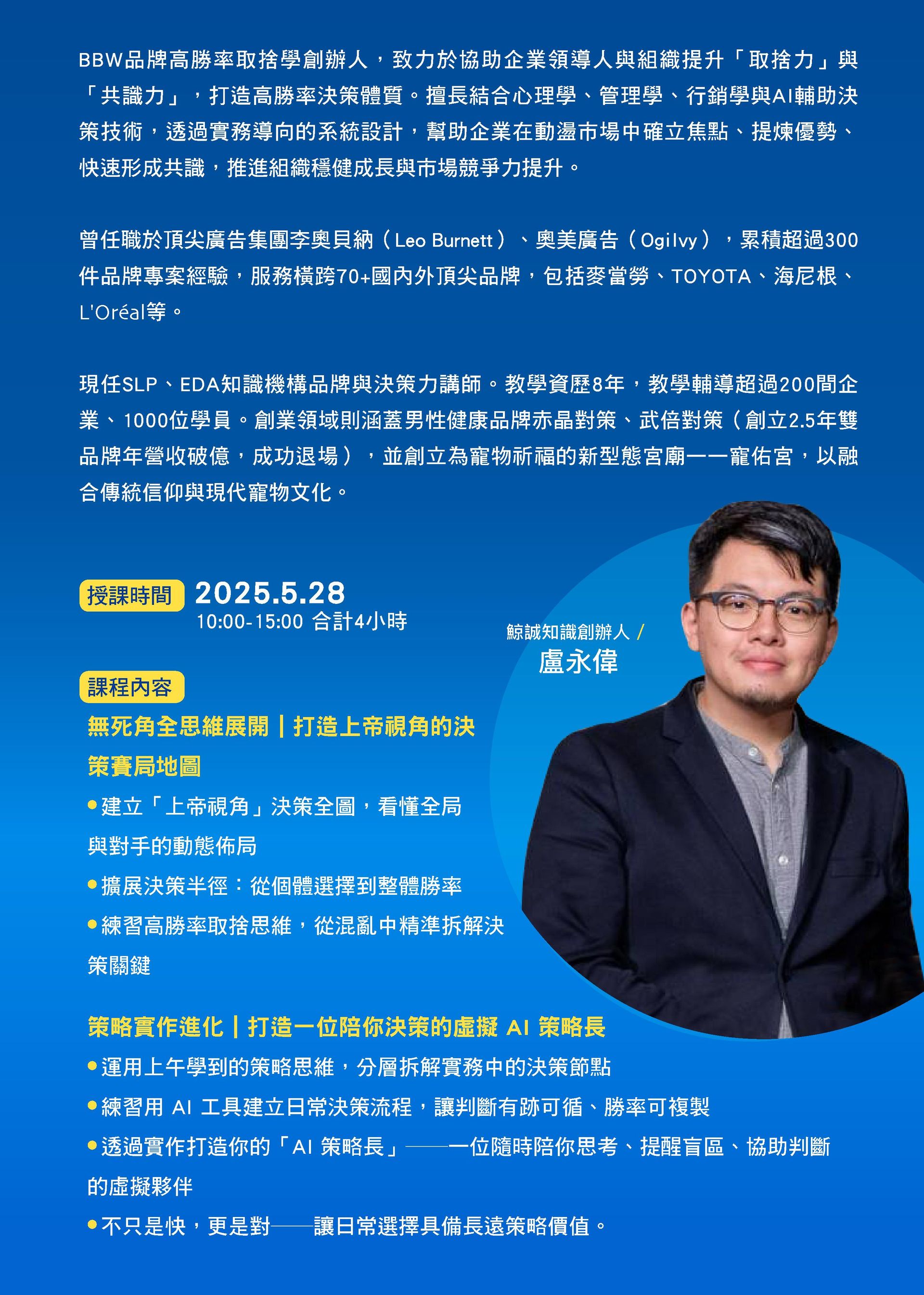 擅長結合心理學、管理學、行銷學與AI輔助決策技術,透過實務導向的系統設計,幫助企業在動盪市場中確立焦點、提煉優勢、快速形成共識,推進組織穩健成長與市場競爭力提升。