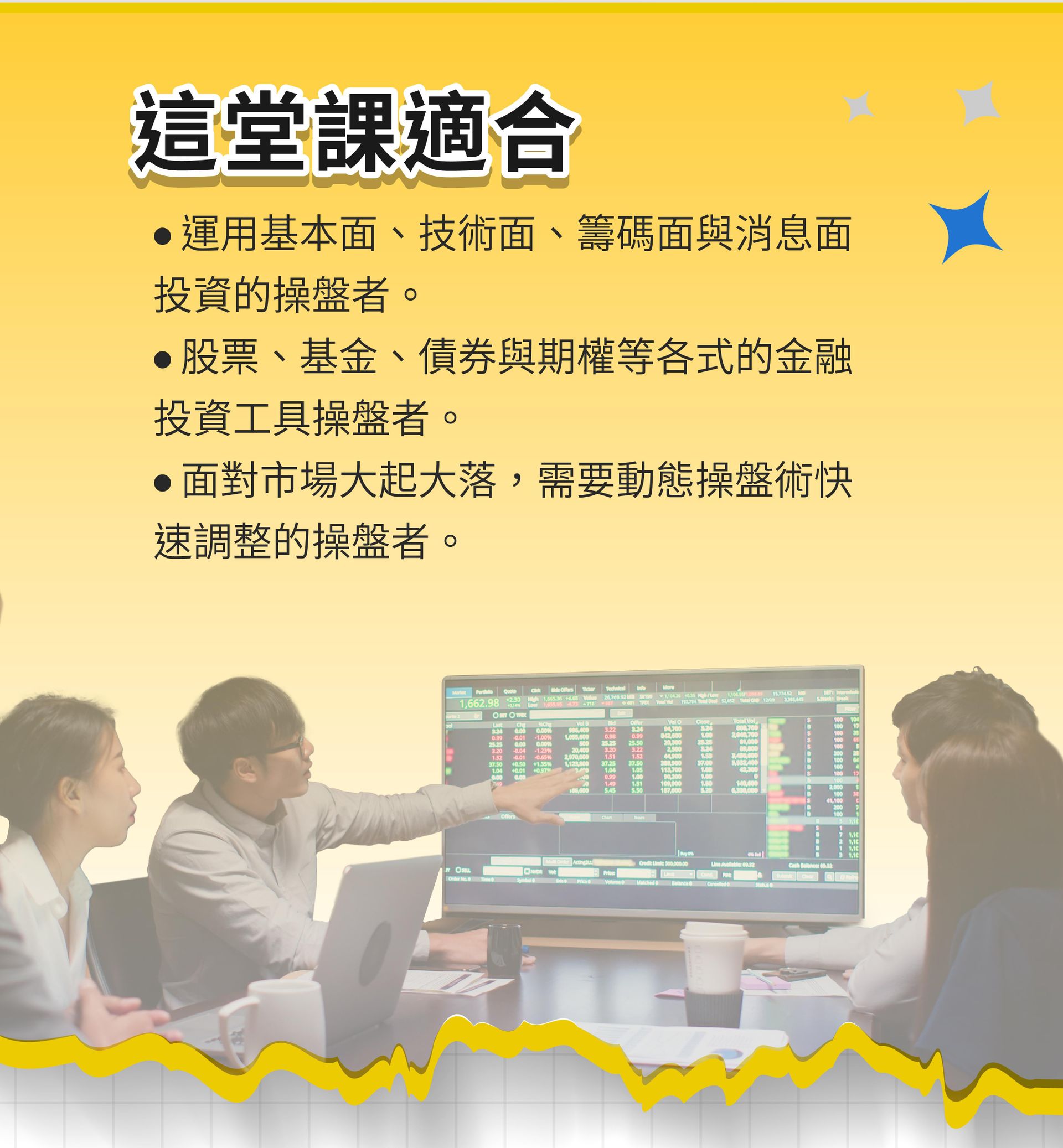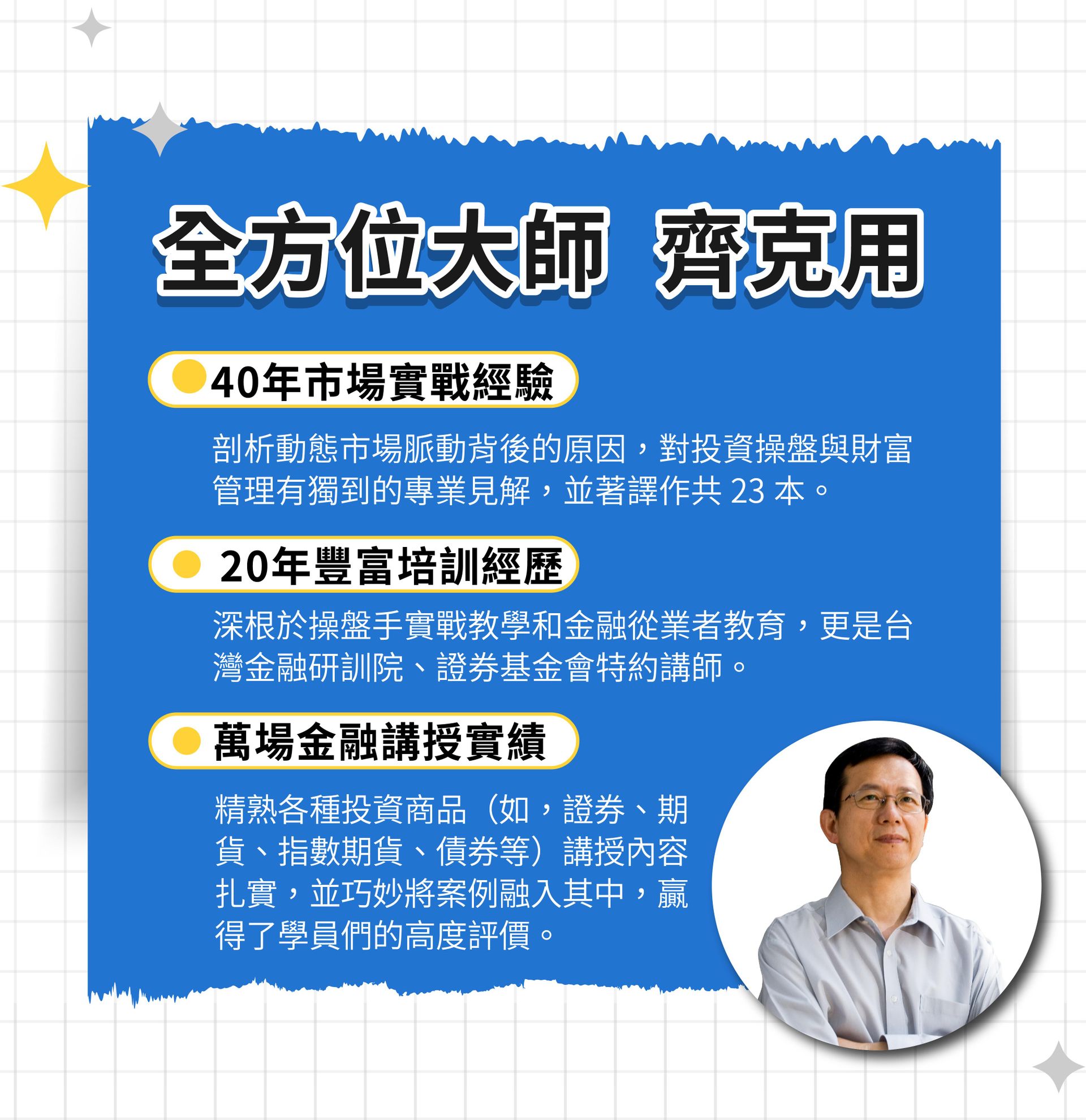 🔸40年以上市場實戰經驗,剖析動態市場脈動背後的原因,對投資操盤與財富管理有獨到的專業見解,並譯作共23本。 🔸超過20年投資理財培訓經歷,深根於操盤手實戰教學和金融從業者教育,更是台灣金融研訓院、證券基金會特約講師。 🔸萬場以上金融講授實績,精熟各種投資商品(如,證券、期貨、指數期貨、債券等)講授內容扎實,並巧妙將案例融入其中,赢得了學員們的高度評價。