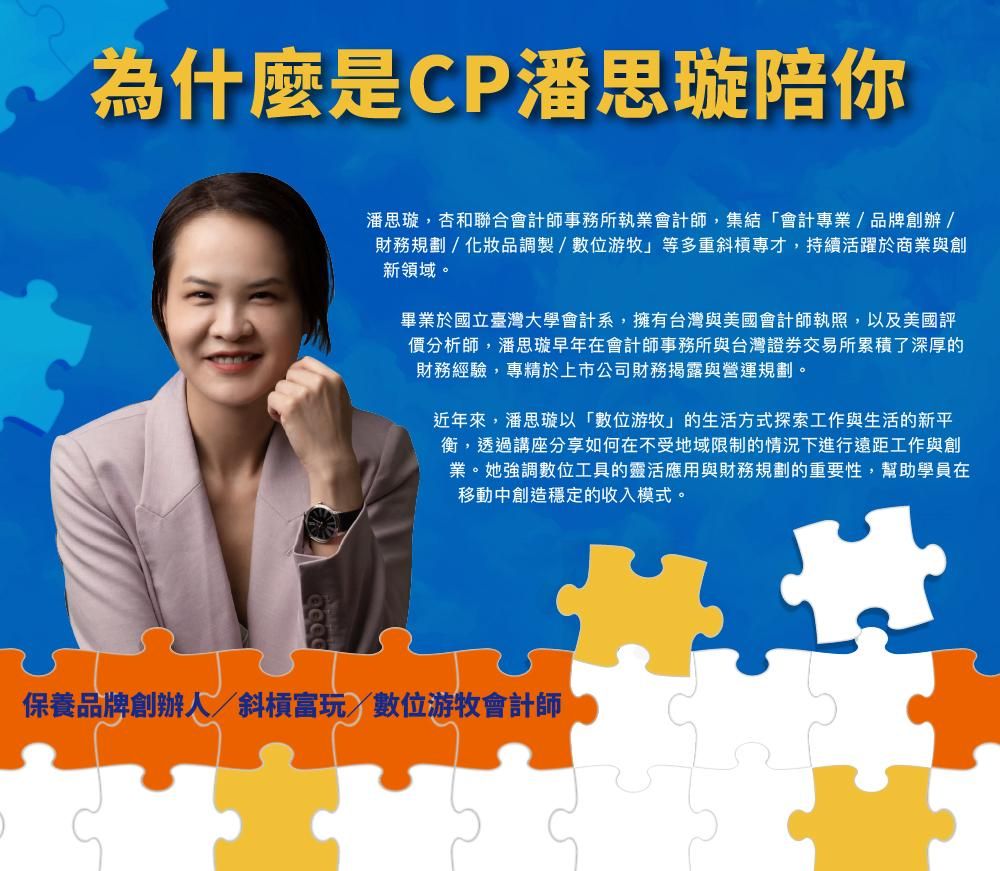 CP 擅長左手算數字,右手寫文案,現從事會計師業務,並擔任兼職財務長、創業與行銷顧問等,同時思考下一個創業題目。
