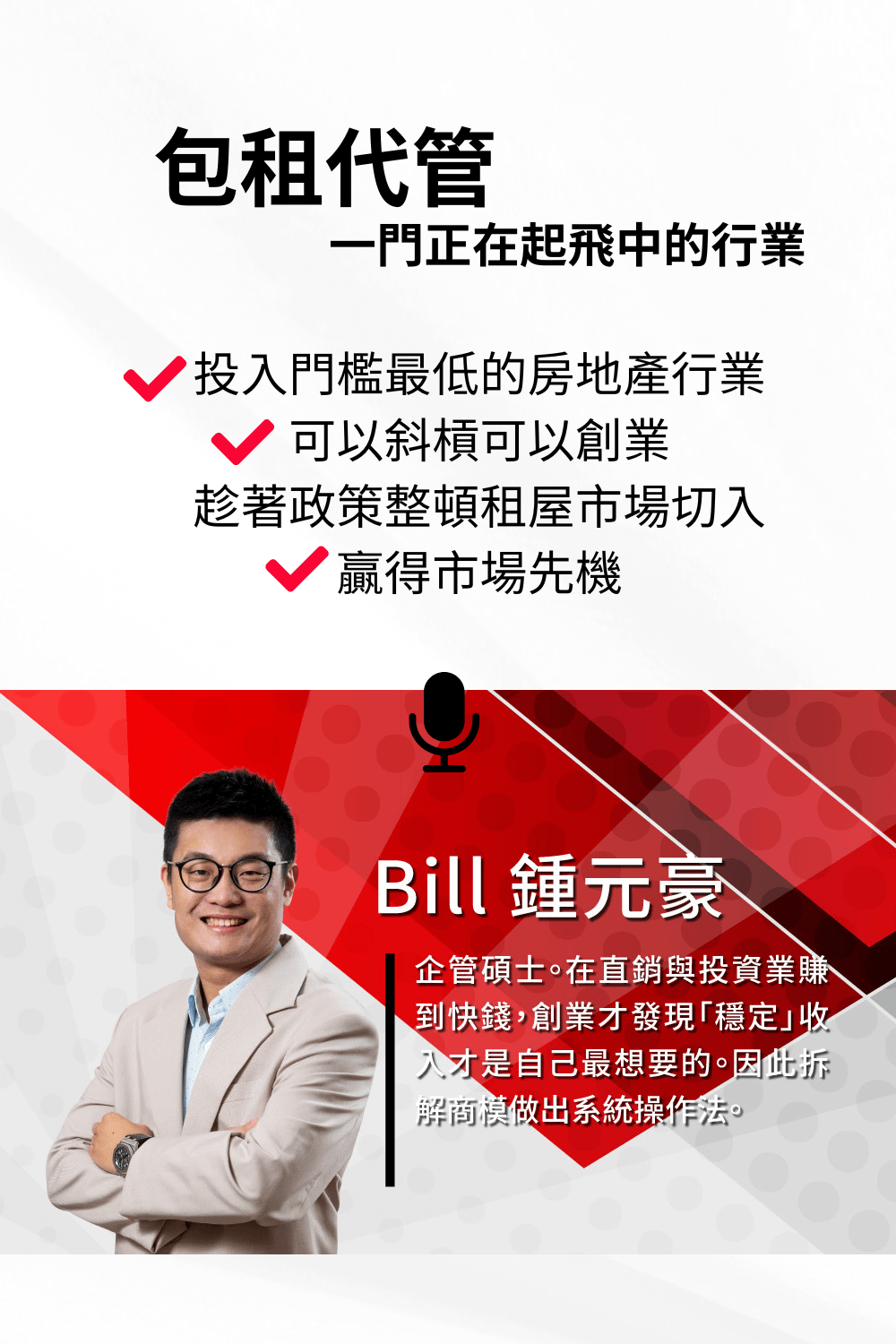 白手起家的年輕包租公,從除甲醛的施工工班跨入房地產,看到房地產包租代管市場的商機大勢。建立獨有的商業模式,讓房東願意釋出房源、乘著政策的順風車建立穩定的現金流。