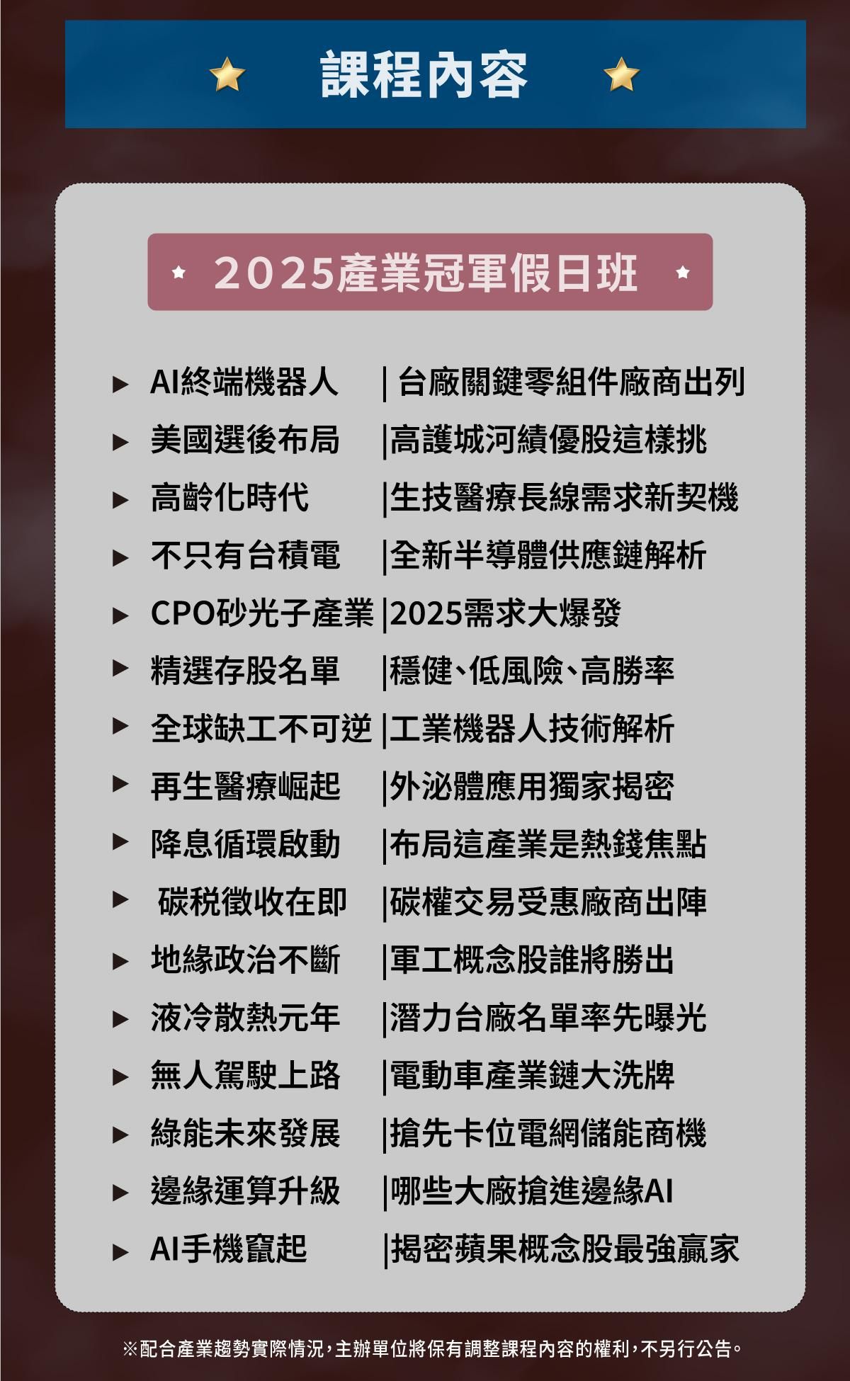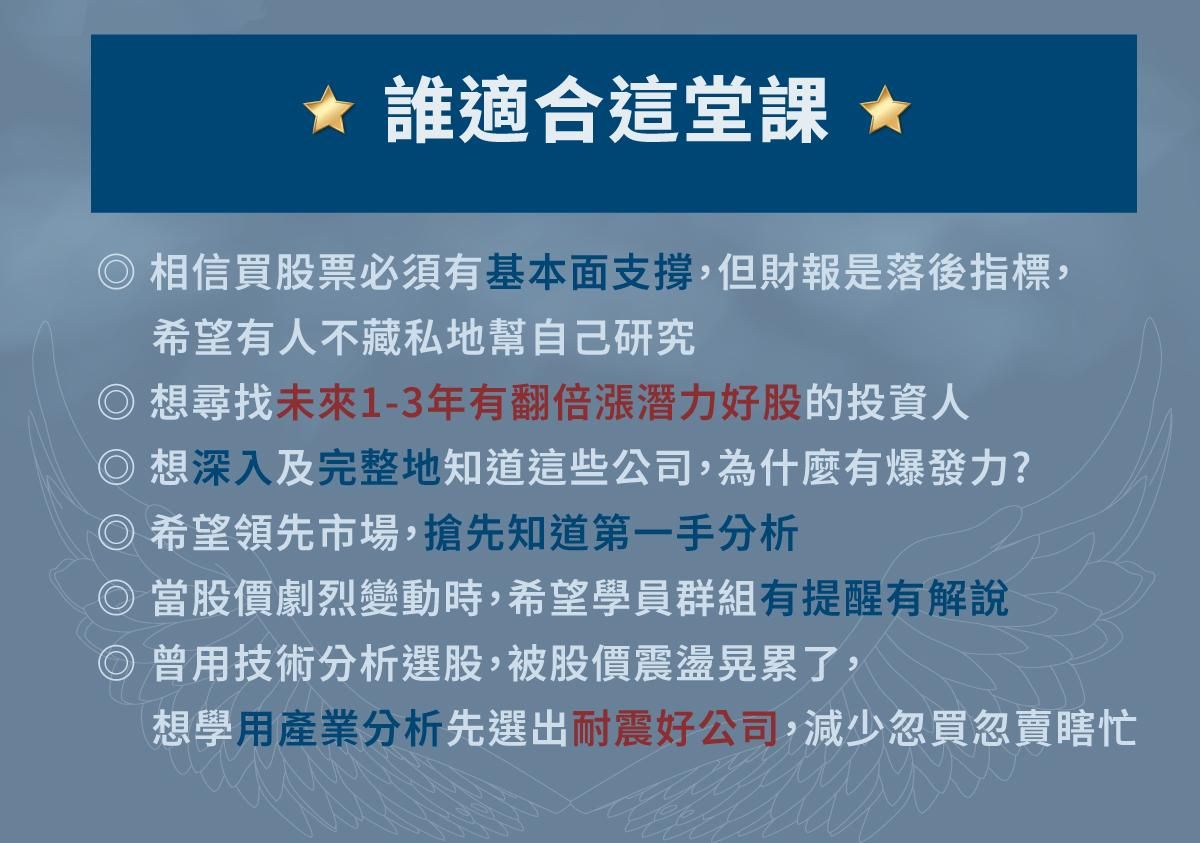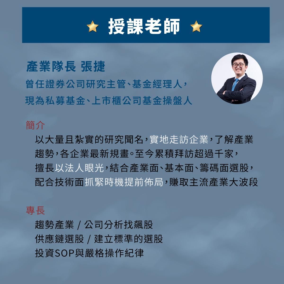 專職投資人 今周學堂產業冠軍班講師 先探金融家講師 各大財經平台媒體特約講師 私募基金經理人 數位專欄作家 成大臺北校友會財經論壇總幹事