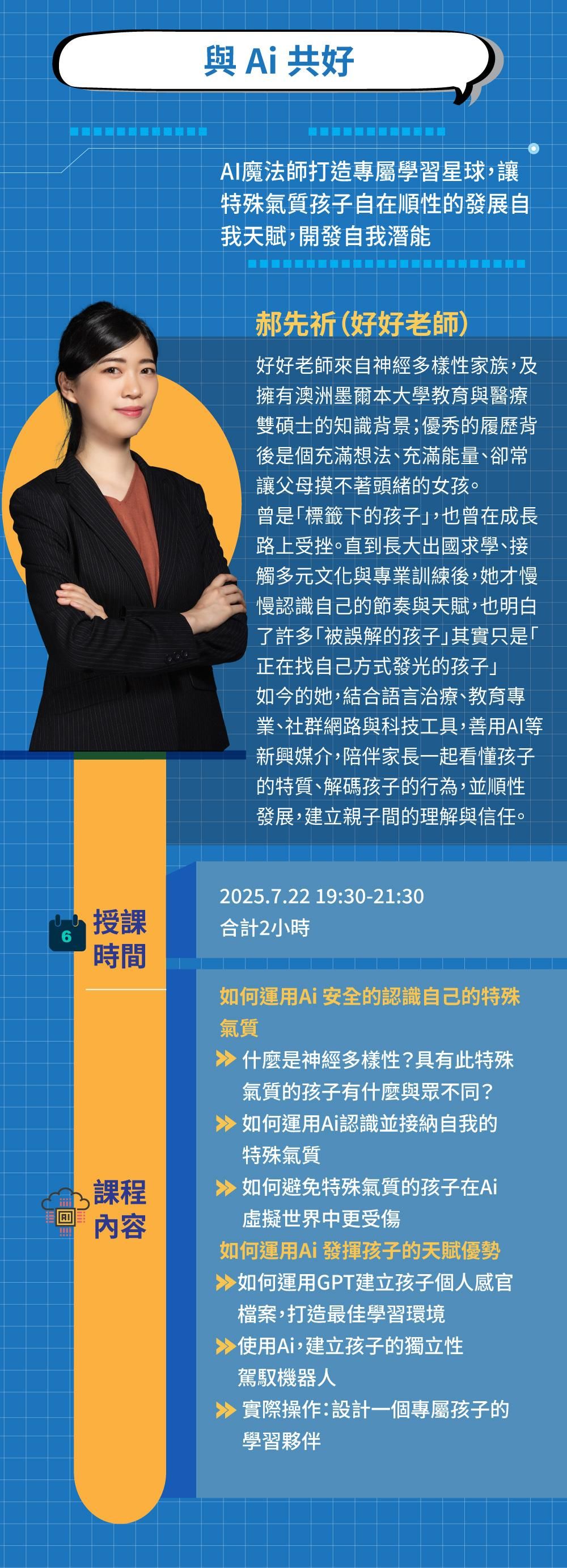 如今的她,結合語言治療、教育專業、社群網路與科技工具,善用AI等新興媒介,陪伴家長一起看懂孩子的特質、解碼孩子的行為,並順性發展,建立親子間的理解與信任。