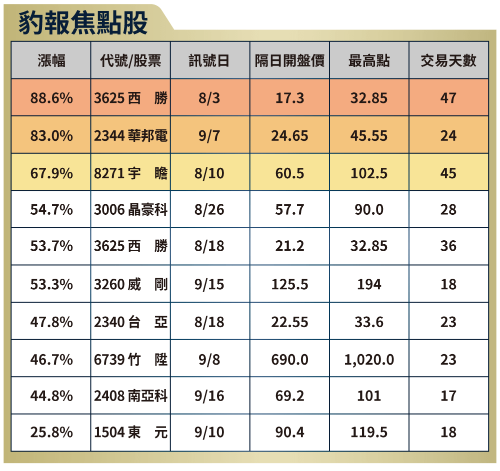 ▲圖表中個股為8月1日至9月30日,每日盤後篩選出的潛在強勢股表現,嚴控風險虧損10%即出場。