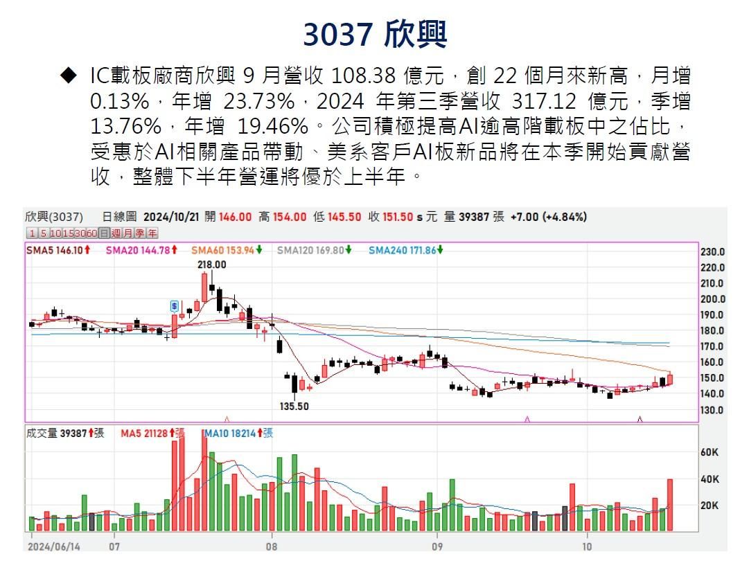 IC載板廠商欣興9月營收108.38億元,創22個月來新高,月增0.13%,年增23.73%,2024年第3季營收317.12億元,季增13.76%,年增19.46%。公司積極提高AI逾高階載板中之占比,受惠於AI相關產品帶動、美系客戶AI板新品將在本季開始貢獻營收,整體下半年營運將優於上半年。