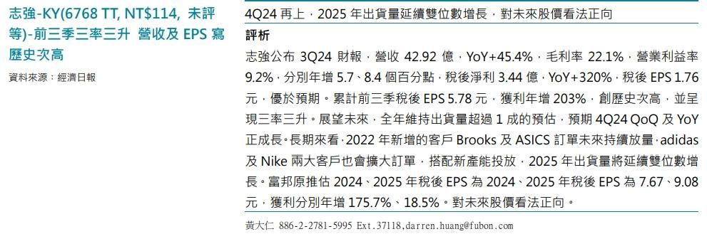 2.長期來看,2022年新增的客戶Brooks及ASICS訂單未來持續放量,adidas及Nike兩大客戶也會擴大訂單,搭配新產能投放,2025年出貨量將延續雙位數增長。富邦原推估2024、2025年稅後EPS為7.67元、9.08元,獲利分別年增175.7%、18.5%。對未來股價看法正向。