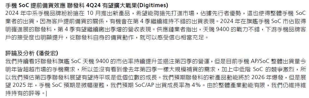 手機SoC提前備貨效應聯發科4Q24有望擴大戰果(Digitimes)