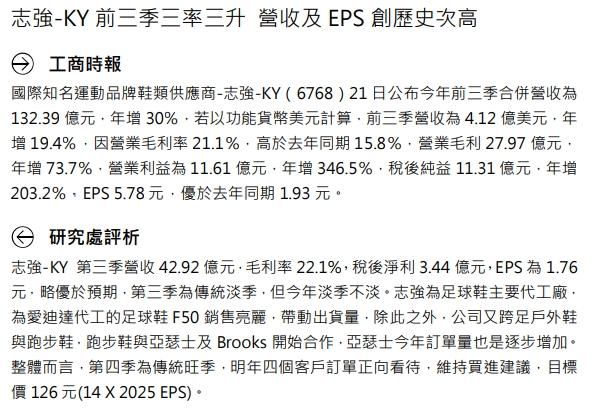 1.國際知名運動品牌鞋類供應商-志強-KY 21日公布今年前3季合併營收為132.39億元,年增30%,若以功能貨幣美元計算,前3季營收為4.12億美元,年增19.4%,因營業毛利率21.1%,高於去年同期15.8%,營業毛利27.97億元,年增73.7%,營業利益為11.61億元,年增346.5%,稅後純益11.31億元,年增203.2%,EPS 5.78元,優於去年同期1.93元。