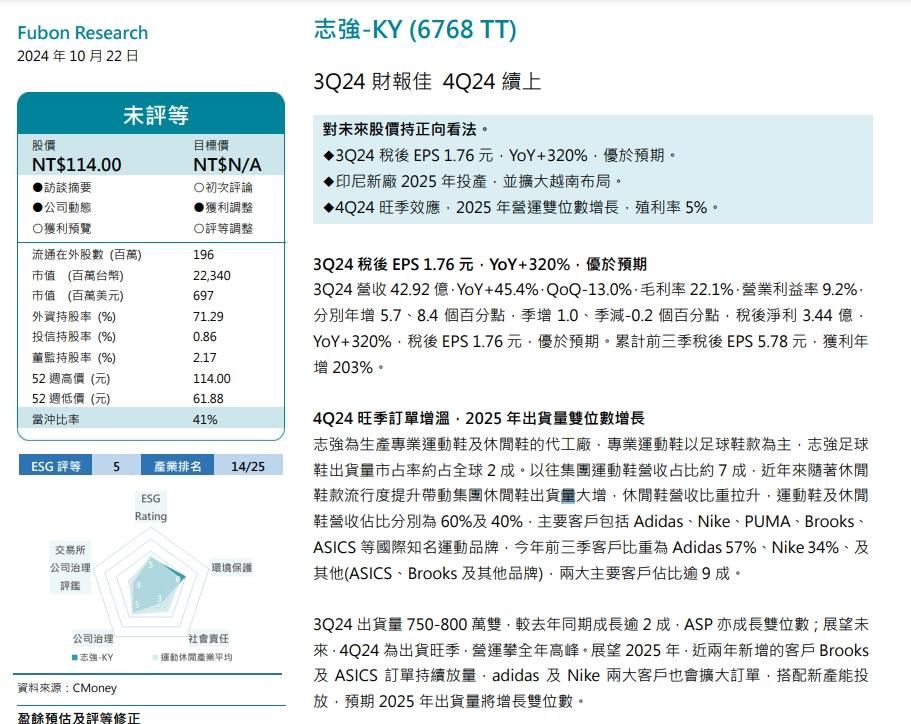 1. 3Q24出貨量750~800萬雙,較去年同期成長逾2成,ASP亦成長雙位數;展望未來,4Q24為出貨旺季,營運攀全年高峰。展望2025年,近兩年新增的客戶Brooks及ASICS訂單持續放量,adidas及Nike兩大客戶也會擴大訂單,搭配新產能投放,預期2025年出貨量將增長雙位數。