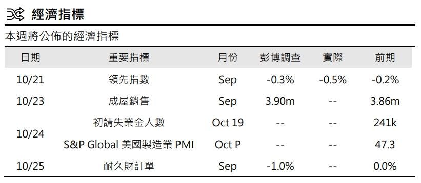 6.本週經濟數據較為冷清,市場焦點轉向僅剩2週就要到來的總統大選選情,以及中東地緣政治的後續變化。財報方面,本週特斯拉、德儀和Barclays等財報將持續為需求前景帶來更多線索。近期美國小型股重回高檔,市場風險情緒回穩,在無重大利空下,料美股有望維持震盪偏多格局。