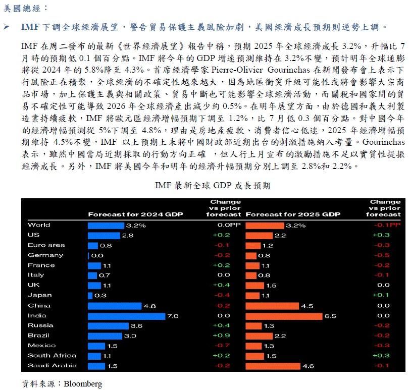 1. IMF上調美國今年經濟成長預期至2.8%,預估明年全球成長持平3.2%:IMF發布10月全球經濟展望報告,維持今年全球成長預期在3.2%,將2025年全球經濟成長預期下調0.1p.p.至3.2%。IMF將美國今明年經濟成長預估上調0.2p.p.、0.3p.p至2.8%、2.2%,主因為更強勁的消費與投資,反映實質薪資成長與財富效果,預期明年成長將因為財政逐漸收緊和就業市場降溫放緩,美國的GDP上修抵消了其餘國家的下修。