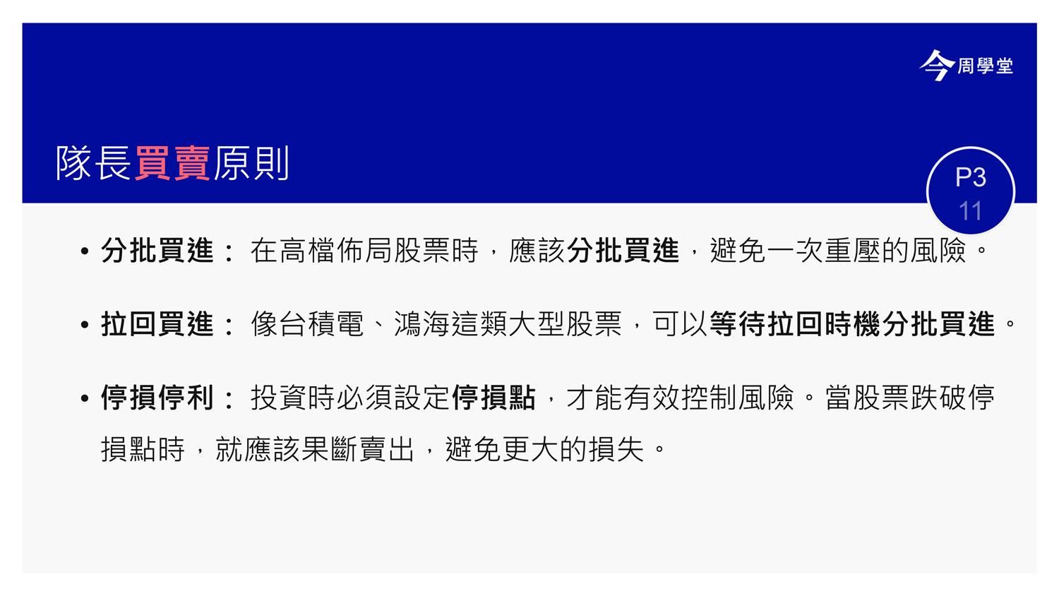 這五個月來,台股常處相對高點,好公司股價自然不便宜。隊長建議想投資獲利,就要留在市場上,大跌大漲時,手上都要有股票,高檔佈局,重點是分批買入,且嚴守停損點,跌破果斷賣出。